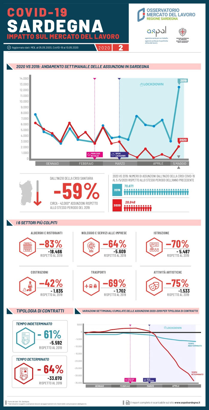 Il nuovo report sull’impatto del Covid-19 dell’Osservatorio del mercato del lavoro dell’Aspal evidenzia che le assunzioni nell’isola sono state 10 mila in meno rispetto alla stessa settimana del 2019 (durante il confinamento la media era 3 mila in meno a settimana).