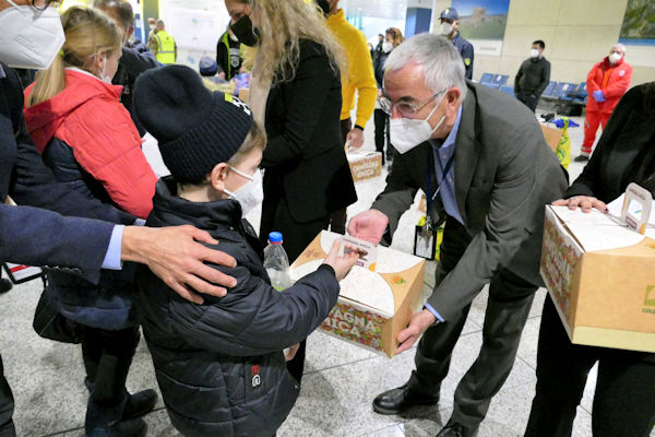 Cagliari, 16 Mar 2022 - Coldiretti, Campagna Amica con la collaborazione di Sogaer (società di gestione dell'aeroporto di Cagliari) hanno accolto in questo modo i bambini e le donne…